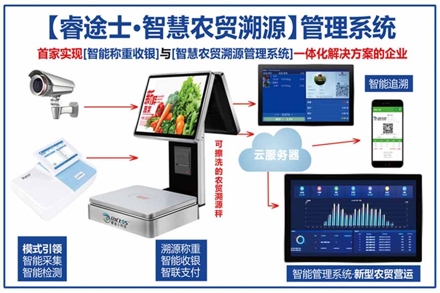創(chuàng)新實現(xiàn)了【智慧農(nóng)貿(mào)溯源管理系統(tǒng)】與【智能稱重收銀】一體化解決方案,集市場管理、運營管理、溯源追溯、智能收銀大數(shù)據(jù)運用于一體,硬件、軟件與管理系統(tǒng)完美結(jié)合。適用于農(nóng)批、農(nóng)貿(mào)市場蔬菜、生鮮、水果、水產(chǎn)、肉類、熟食等稱重和非稱重銷售;由于采用一體化設(shè)計,解決了傳統(tǒng)農(nóng)貿(mào)市場無法實現(xiàn)的信息化、智能化、可追溯的管理問題;使稱重、收銀、追溯、管理、更透明、公正、安全,讓顧客無后顧之憂,給管理工作帶來極大的便捷與高效,對國內(nèi)農(nóng)產(chǎn)品行業(yè)的發(fā)展、農(nóng)產(chǎn)品流通管理起到了典范作用。 【睿途士首創(chuàng)】顛覆傳統(tǒng)的“智慧農(nóng)貿(mào)市場系統(tǒng)”,解決了傳統(tǒng)農(nóng)貿(mào)系統(tǒng)單一安卓掛屏,昂視不方便看、不直觀、無互動性,傳輸信息不齊全、不穩(wěn)定的問題,也解決了按鍵電子秤商品難找、商品代碼難記、按鍵操作不靈活、支付不智能,對收銀管理、銷售商品、菜名、菜價、打折、優(yōu)惠、會員、線上下單、采購等無法實現(xiàn)實際菜品交易和追溯等問題。 更具顛覆性的是睿途士智慧系統(tǒng)擁有三大管理平臺(市場管理平臺、總部運營管理平臺、商戶后臺管理平臺)、一個可視操作前臺和三大追溯功能,讓遠程管理、數(shù)據(jù)傳輸、人機互動、智能控制、移動支付、大數(shù)據(jù)、互聯(lián)通信、云端存儲、人工智能、智能城市、電子定位、智能收銀等功能得以實現(xiàn)。